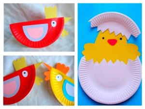 Още по-сложни апликации си струва да предложите на децата в детската градина. За целта ще са ви необходими шаблони на петел и пиле, дебели бели листове, бои и четки, цветна хартия и салфетки в различни цветове, ножица, перфоратор и лепило.