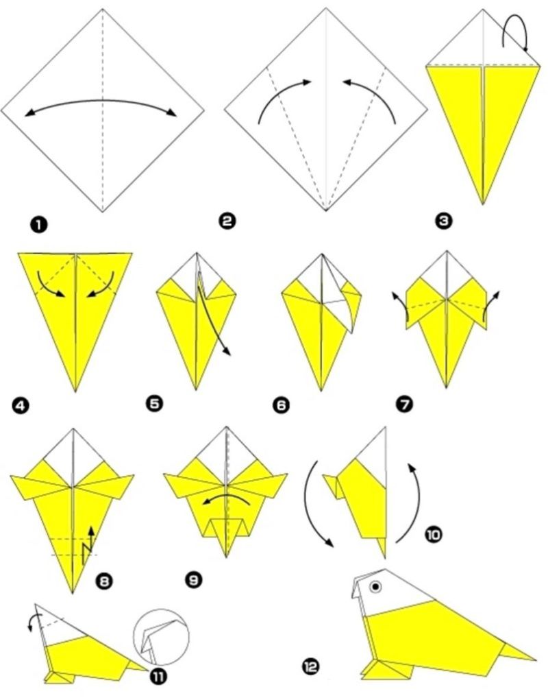 Също така от черна хартия трябва да изрежете крила (извита ивица със стеснени краища, наподобяваща формата на отворените крила на лястовица), а от жълта хартия - малки квадратчета, които се сгъват по диагонал - това са клюновете на птиците.