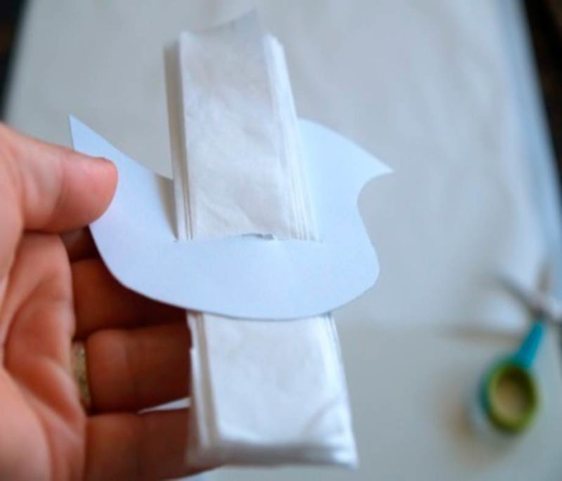 Изрежете ленти от бяла хартия с дължина 8-10 см и дебелина 3 см. Същите ленти се изрязват от черна хартия, но те трябва да са дълги 15-16 см и да имат по-дебел долен край. Тя е изрязана във формата на лястовича опашка.