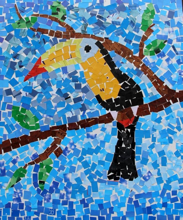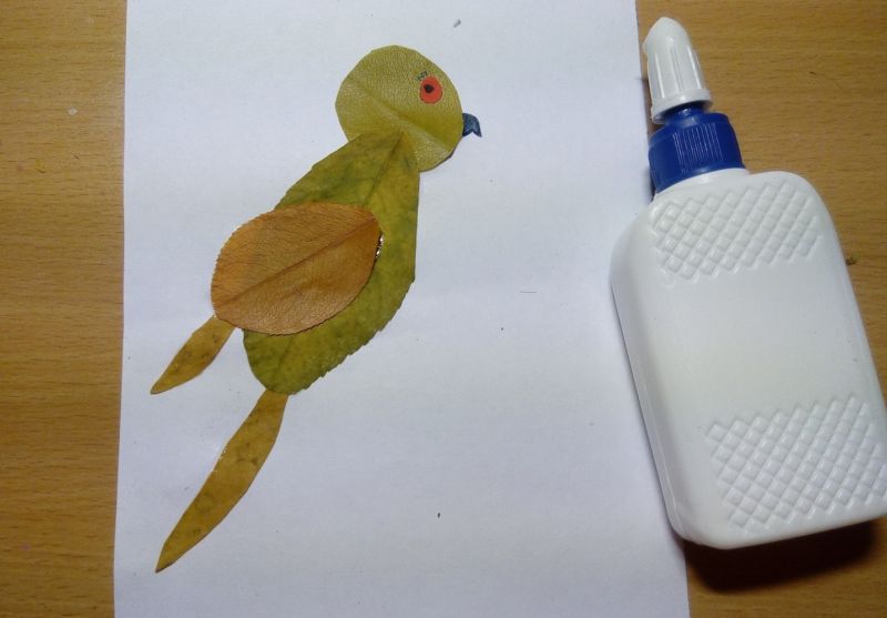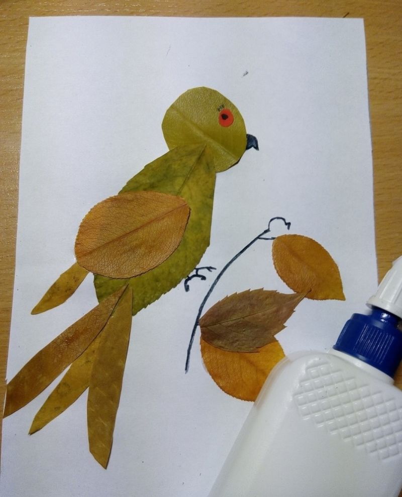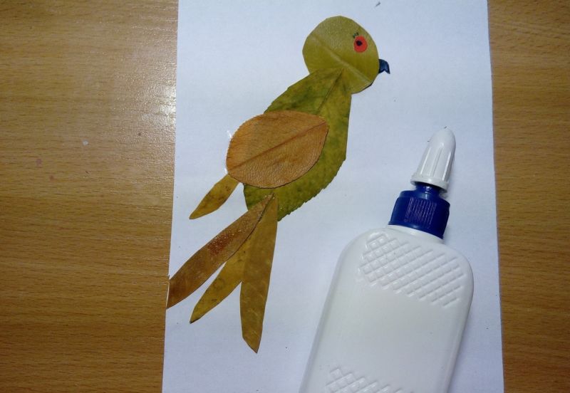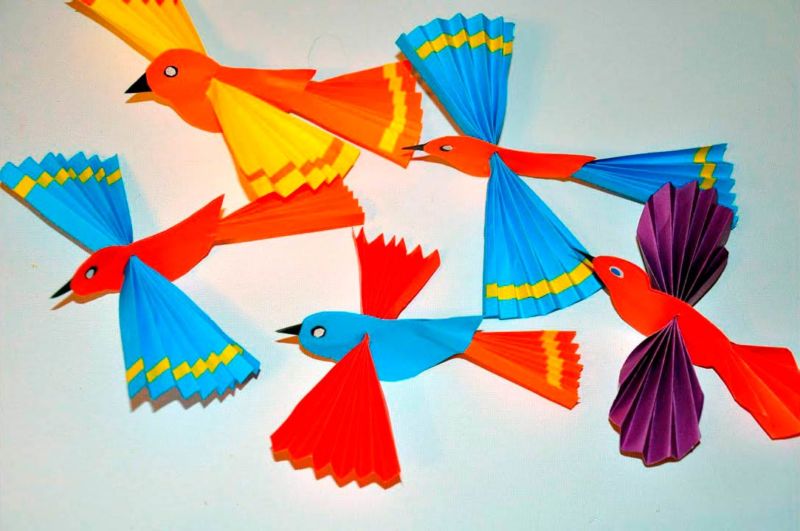 Можете да създадете впечатляваща изработка дори без шаблон за колаж с птици - трябват ви само цветна хартия, бял картон (А3), лепило, ножица, молив, флумастери и украшения.