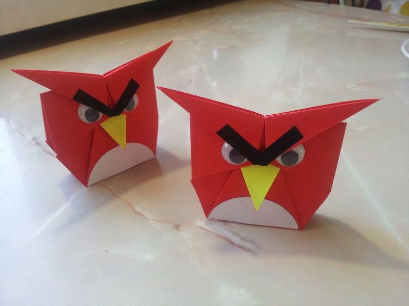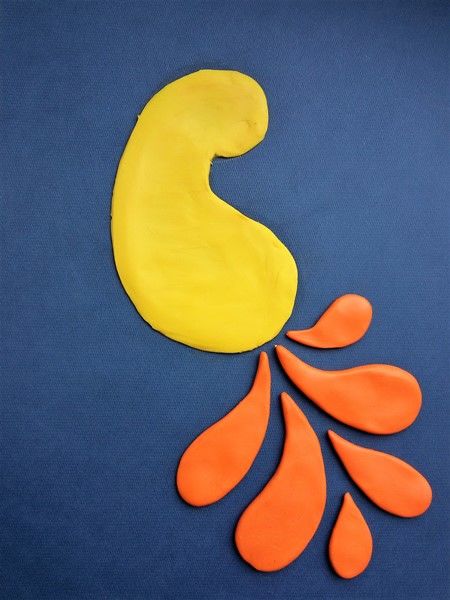 Жълтите очи, черните зеници и жълтият клюн са изработени от пластилин. Перата могат да се изработят с всякаква техника - от памучни бучки, парчета хартия, конци и др. Крилата могат да бъдат издълбани от хартия или да бъдат направени от пластелин, а перата могат да бъдат изработени със специален стикер.
