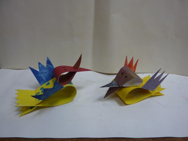 Целият диск се използва за изработване на главата или тялото на птицата, а разрязаните наполовина дискове се използват за крилата или опашката. Тези части се залепват към картона в съответния ред и се оцветяват. От глина могат да се направят лапички, човка, мидичка и брада, очи.