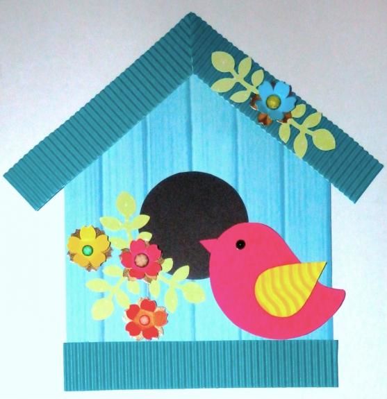 - Къщичката за птици се изрязва от кафява хартия, а прозорчето в нея може да се направи от черна хартия или да се нарисува с черна боя;