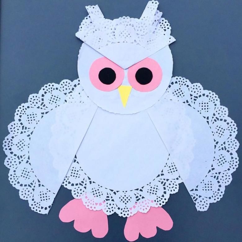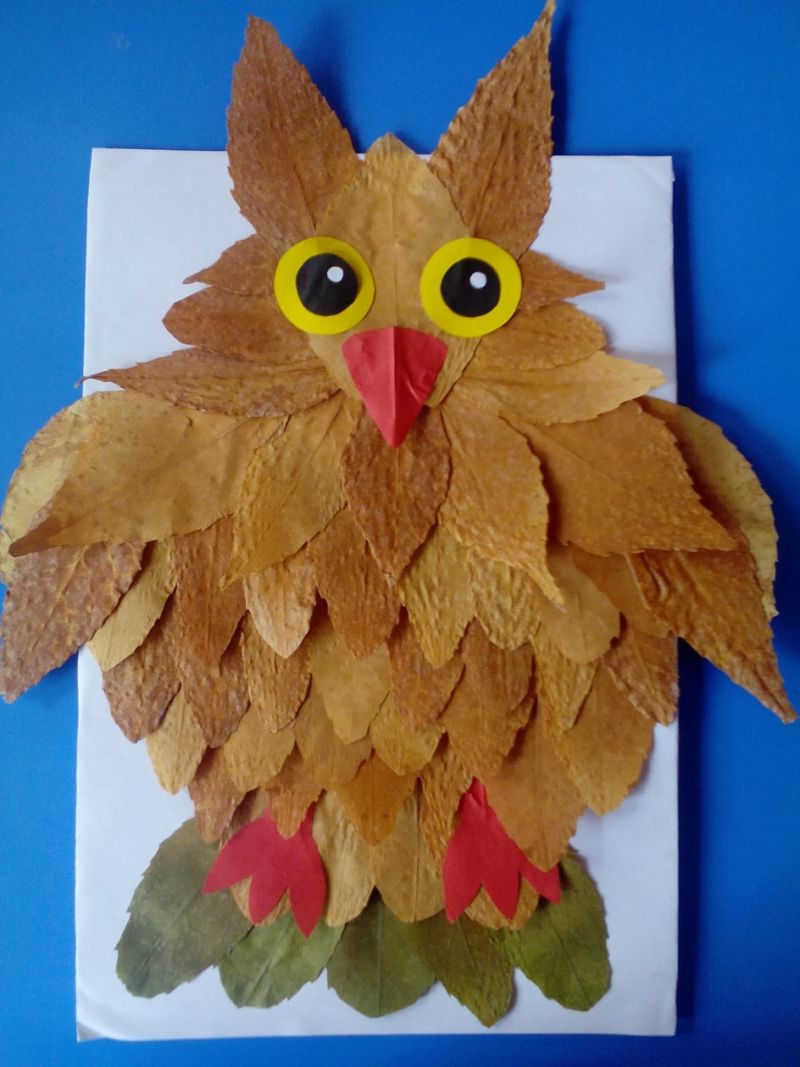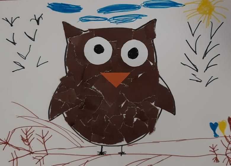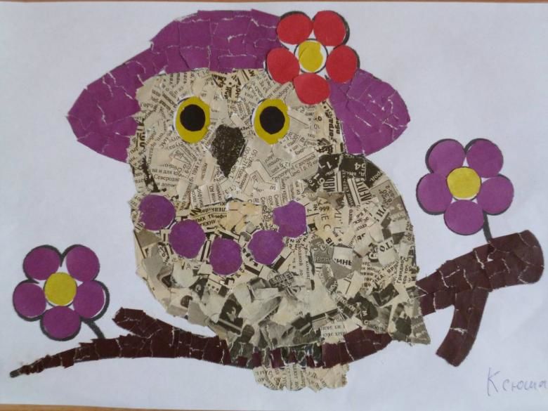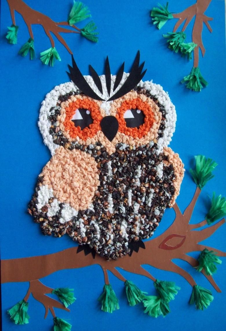 Изображението на сова е подходящо и за работа в група. Възрастните трябва просто да нарисуват тялото на птицата заедно с главата върху голям лист хартия.