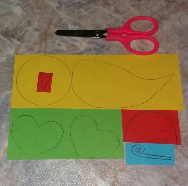 Навийте на руло жълти и оранжеви ленти, с които ще украсите главата, клюна и някои места по тялото. След това трябва да изпробвате частите от скицата и да ги залепите. Можете да оставите пропуските такива, каквито са, или да сглобите още няколко елемента и да запълните пропуските.