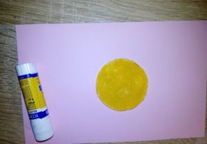Изрежете облаците от обикновена бяла хартия и слънцето от жълта хартия, след което ги залепете към основата.