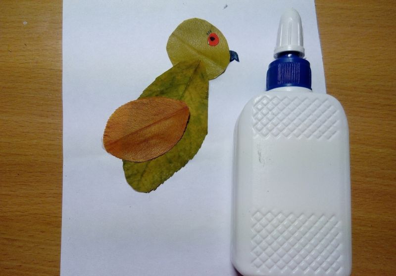 На всяко дете трябва да се даде задача да направи перо за птицата. Не е необходимо да посочвате как трябва да се направи - оставете децата да покажат въображението си. Перата се събират в опашка и се залепват към основата.
