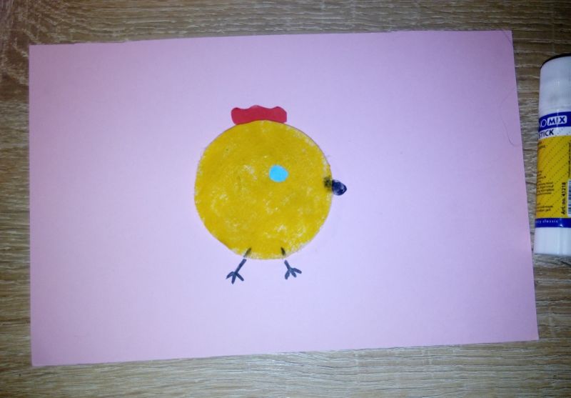 Сега можете да развихрите въображението си: например да очертаете залепените ръце с линийка, да залепите тялото с памук и да го оцветите, да нарисувате или изрежете очите и човката и да ги залепите.