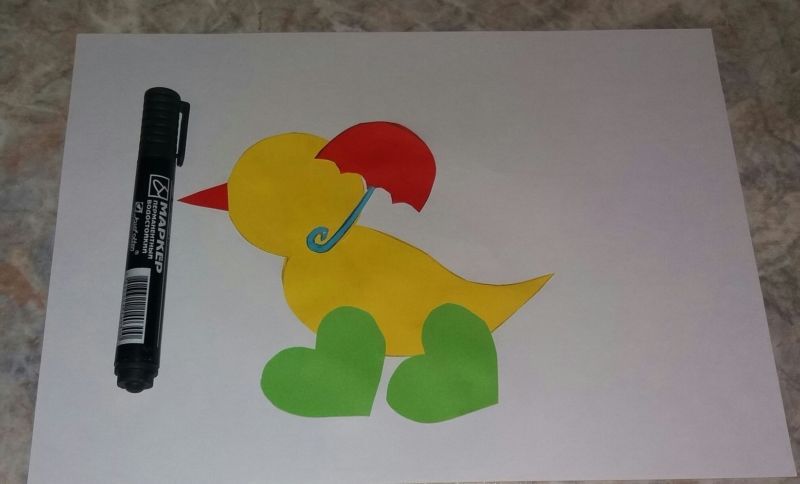 В средата на белия лист, близо до долния край, нарисувайте тялото на птицата заедно с главата. Крилата могат да се скицират и очертават само с черен флумастер (или с друг ярък, наситен цвят).