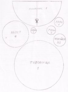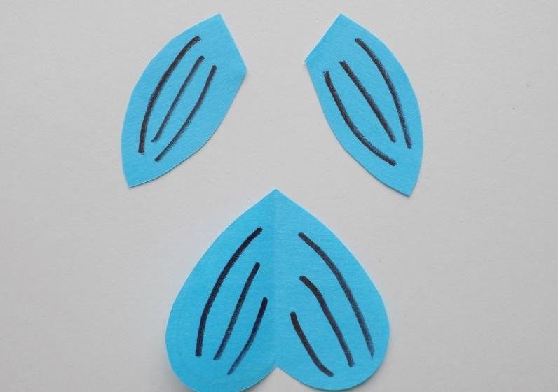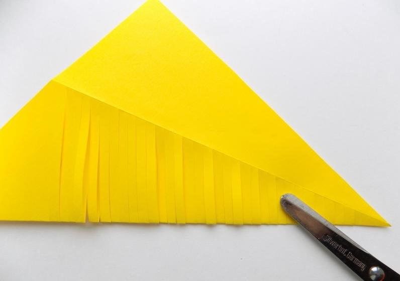 Останалият материал трябва да се нареже на купчина тънки ленти. Всички те се слепват наполовина и след това се прикрепят към заготовката на продукта. Второто парче, което е по-малък полукръг, ще се превърне в перка. Очите и другите необходими детайли се рисуват с флумастер.