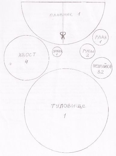 - Самото тяло е облицовано отвътре с кръгчета в жълт цвят. Опашката и перките са облицовани с тънки ленти;