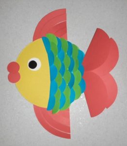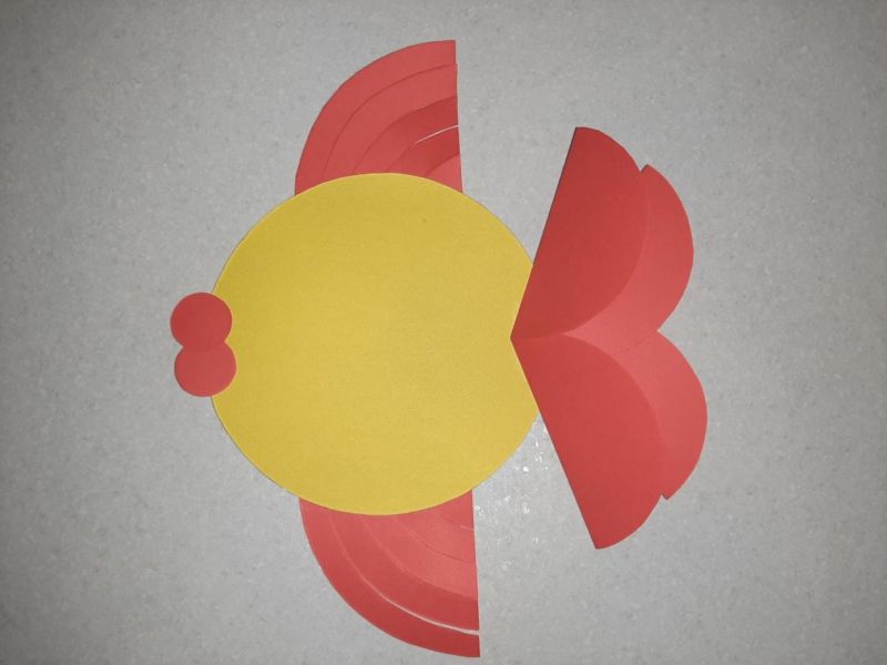 Тази ръчна изработка на риба е не по-малко красива и е чудесна за деца. За да го изработите, трябва да изрежете парче, което да служи за основа, от лист цветен картон. Един от тях, полукръг, се залепва върху хартията.