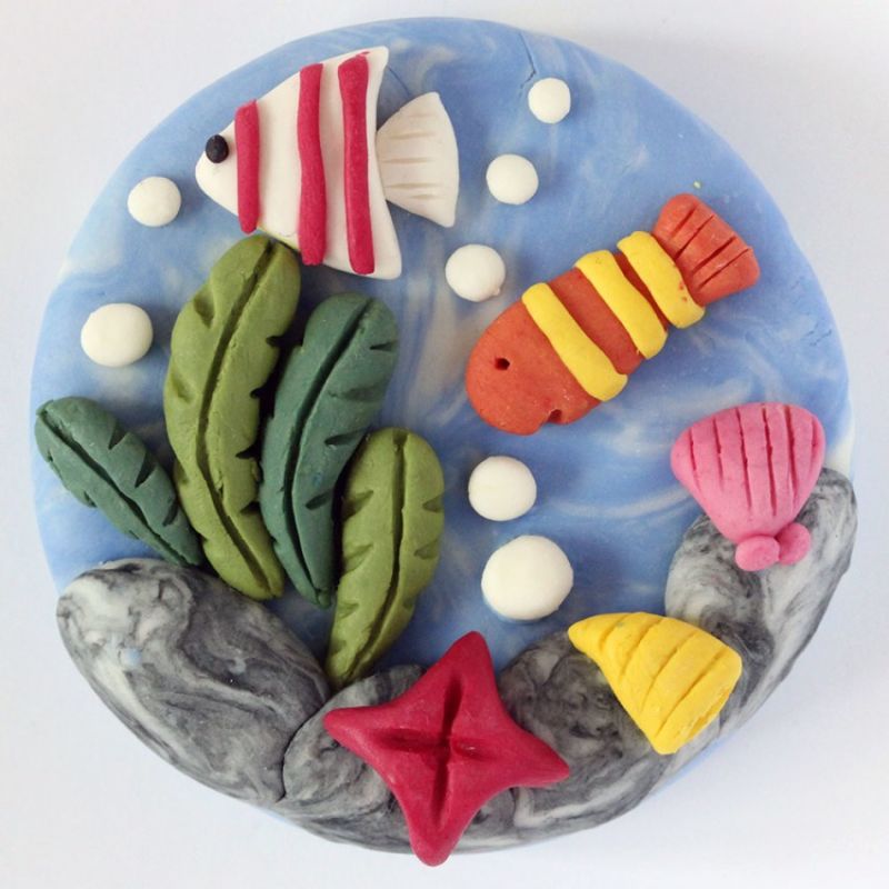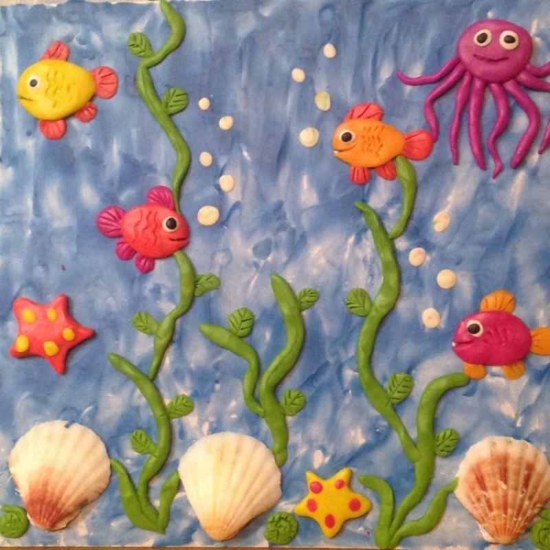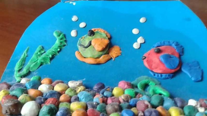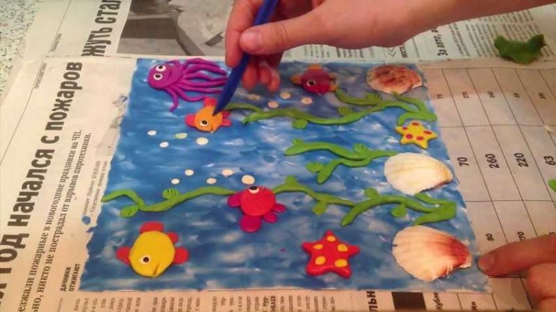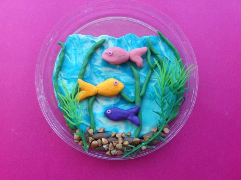 След като всичко е готово, започнете да украсявате фона. Оформете водорасли, камъни, раковини и други желани неща от пластилин, за да завършите апликацията на рибата. Малките камъчета или раковини могат да бъдат дори истински, ако са налични, разбира се.