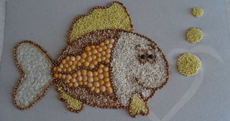 - Сега можете да залепите семена, зърнени храни или макаронени изделия върху лепилото, като по този начин изградите самата рибка. Важно е да го направите внимателно, така че да е чисто и подредено;