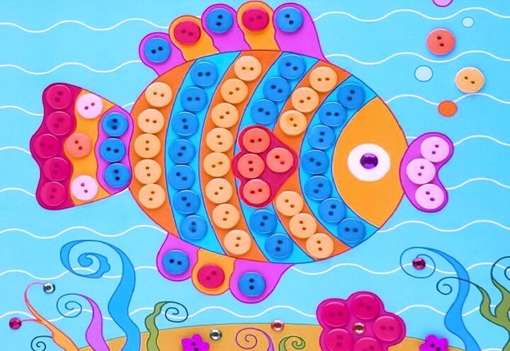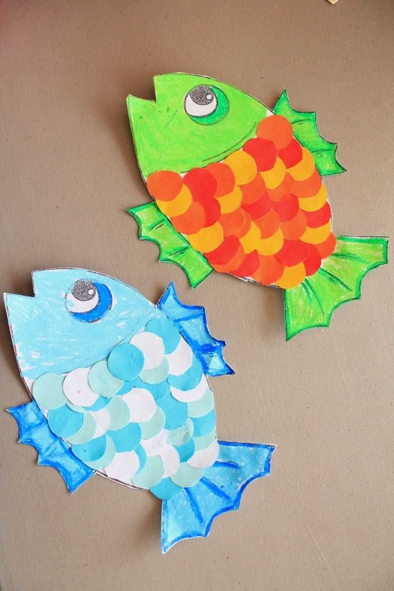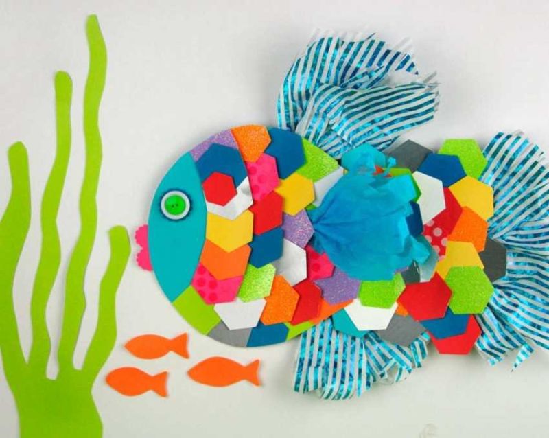 Този колаж от цветни хартиени риби също е лесен за направа, а резултатът със сигурност ще ви зарадва. А за да го постигнете, трябва да направите следното: