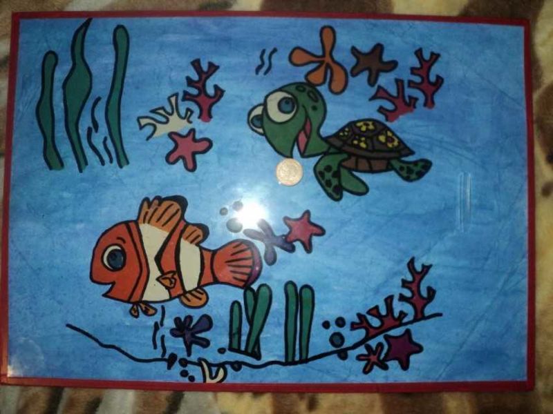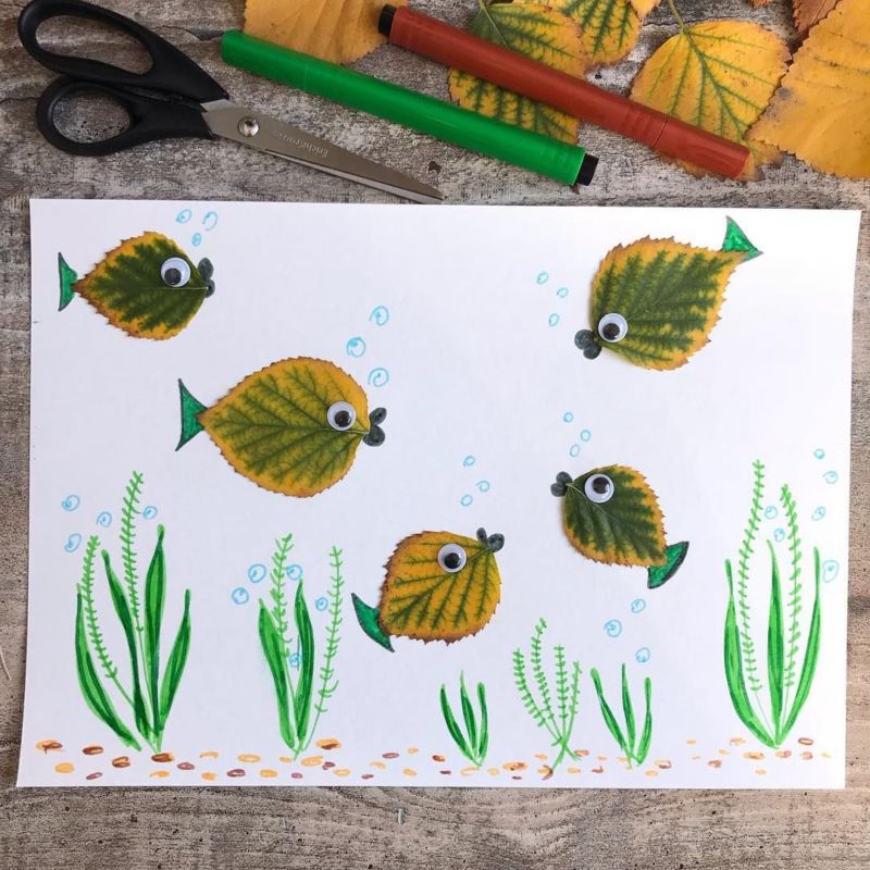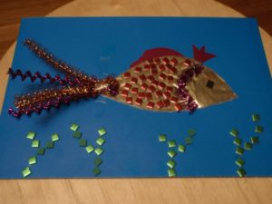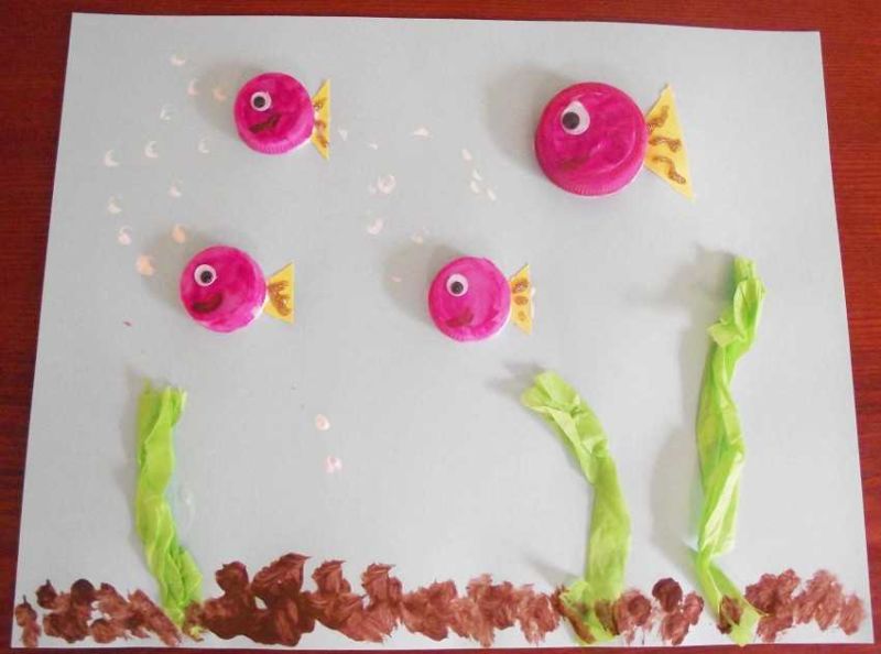 Към фона могат да се добавят водорасли, като се изрежат различни по дължина ленти в зелени нюанси. Би било забавно да нарисувате нещо с ярки флумастери.