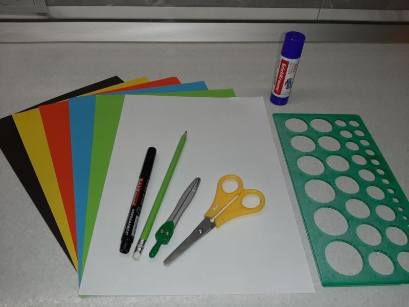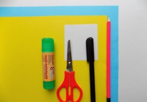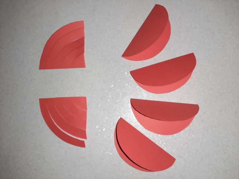 - От двустранната хартия по ваш избор изрежете много тесни лентички с еднакъв размер и залепете краищата на всяка от тях; Всички залепени лентички трябва да бъдат залепени по цялата основа, равномерно разположени една след друга. Свободна трябва да остане само главата;