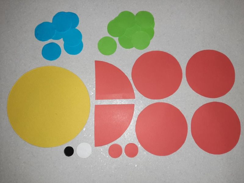 - От разноцветна хартия се изрязват четири големи кръга за телата на рибите, четири средни кръга за опашките и няколко малки кръга за перките;
