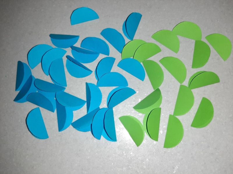- Всеки кръг се сгъва наполовина и след това два полукръга с различни цветове се съединяват, за да се получи една риба. След това можете да залепите останалите части: опашките и перките;