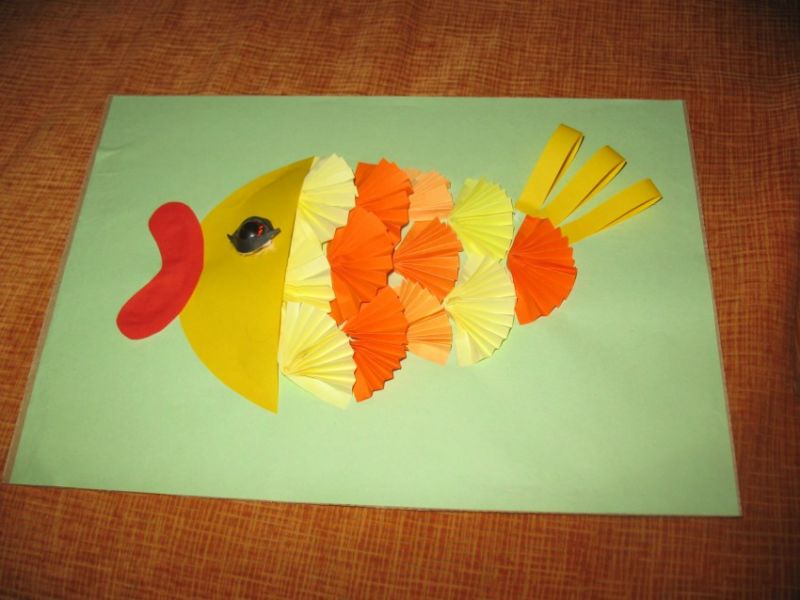 Подобна версия на апликация с рибки в аквариум е чудесна за деца, както от младшата, така и от средната група. Те не само ще се забавляват, създавайки продукта, но и ще се запознаят с различни форми. Изработката се състои от няколко етапа: