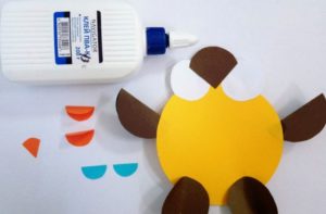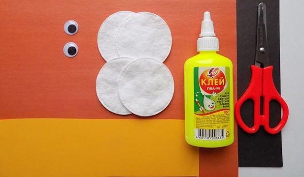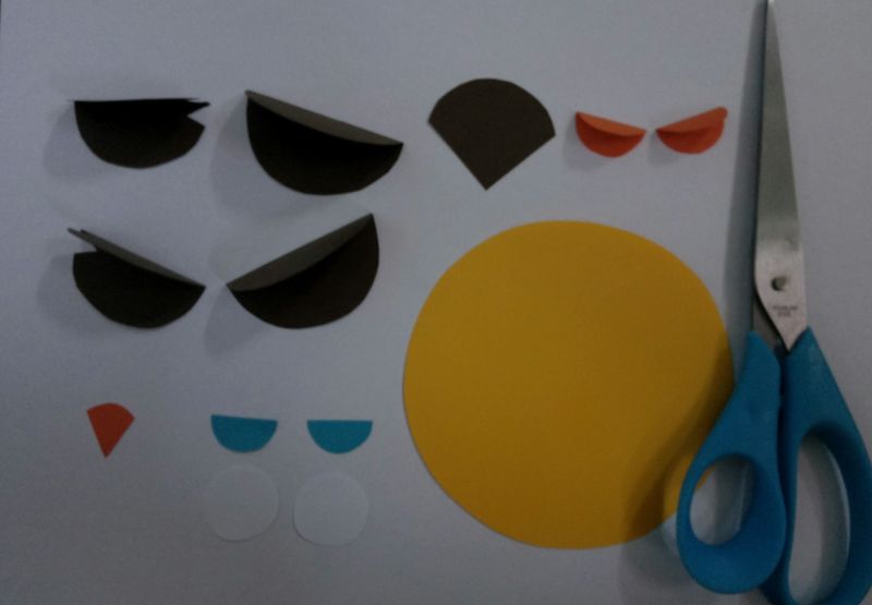 - цветен картон (кафяв, оранжев, черен) за очите и човката.