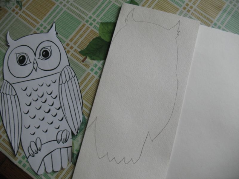 Фонът на апликацията трябва да бъде очертан така, че фрагментите от тялото на бухала да не излизат извън скицата. За да направите това, очертайте с молив контура на фигурата, където ще бъдат залепени заготовките за салфетки.