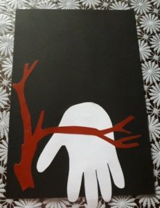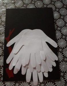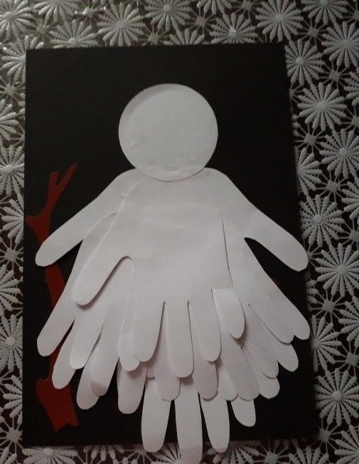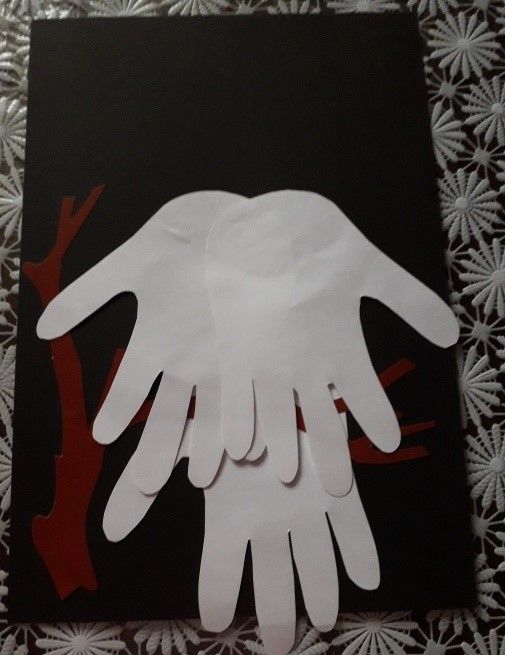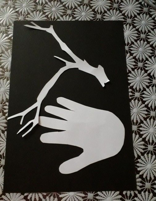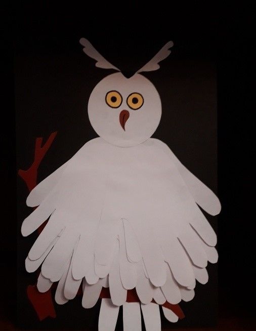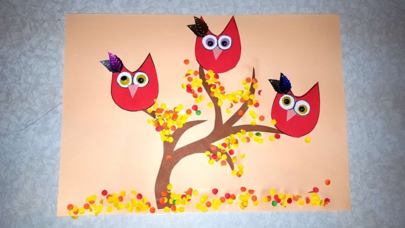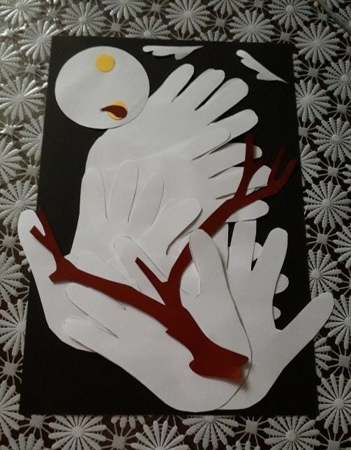 Някои от елементите могат да бъдат боядисани, а клюнът е добре да бъде направен от парче картон, което да придаде малко обем. Композицията може да бъде допълнена с елементи от нощния пейзаж - звезди и луна.