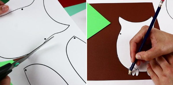 Предимството на този бухал е малкият брой прости форми. Започнете да подготвяте шаблони и цветна хартия, за да изрежете частите на бухала и клон на дърво, на който да "кацне" бухалът.