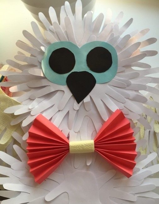Детските ръце могат да се използват като шаблони за бухал, който може да се проследи с молив върху салфетки. Меките им "длани" са лесни за оформяне на тялото и крилата на бухал - те ще приличат на пухкави пера.