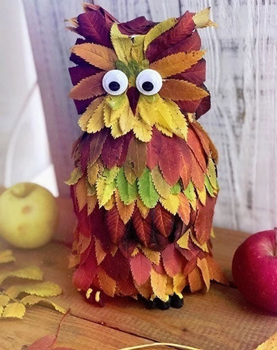Метод 1 - покрийте пластмасова бутилка с отрязани капачки с есенни листа. Когато тялото е готово, добавете очите, веждите и човката.