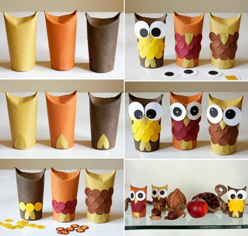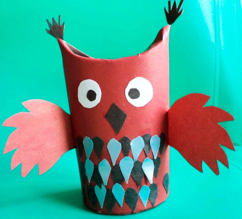 Главата може да се изработи отделно, като върху заготовката на торса се постави "капачка". Формата на очите и човката не е задължителна. Бухалът може да се настани върху пънче, направено от кафява намачкана хартия, залепена с ръкави от тоалетна хартия или картонена заготовка с желаната форма.