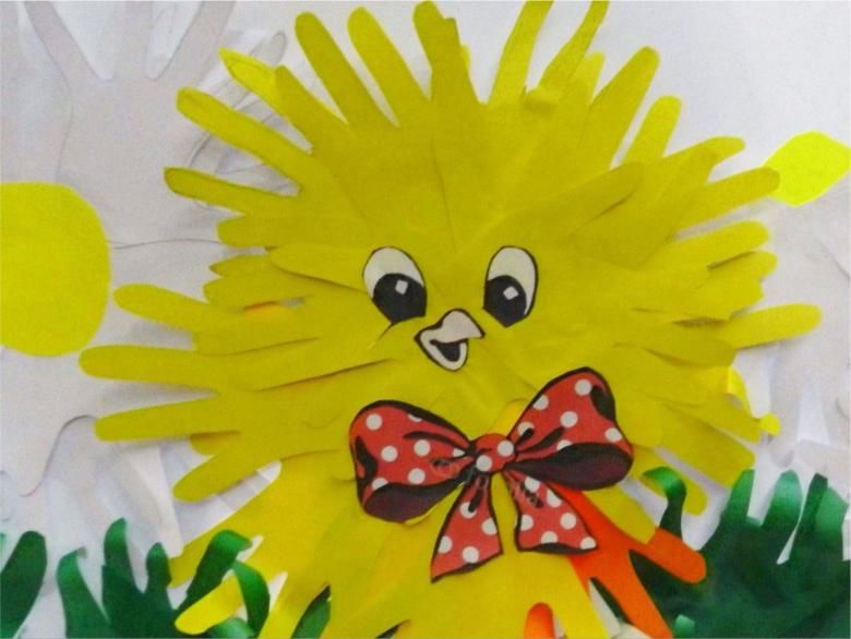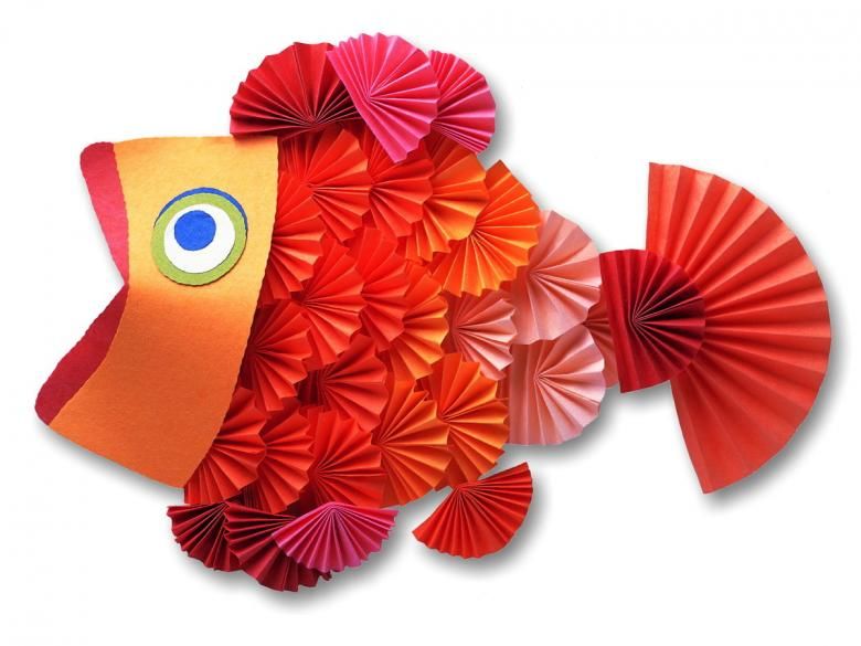 Изрежете по-малък овал за гърдите и кръг за главата. Оранжев - триъгълна човка и плавници. Всички части трябва да са добре залепени към основата.