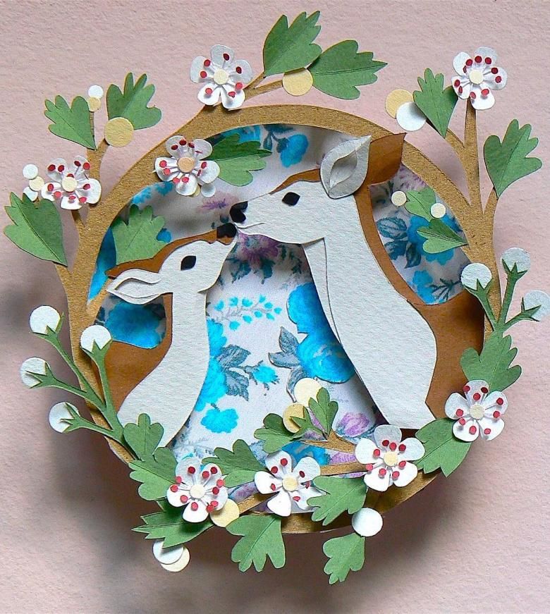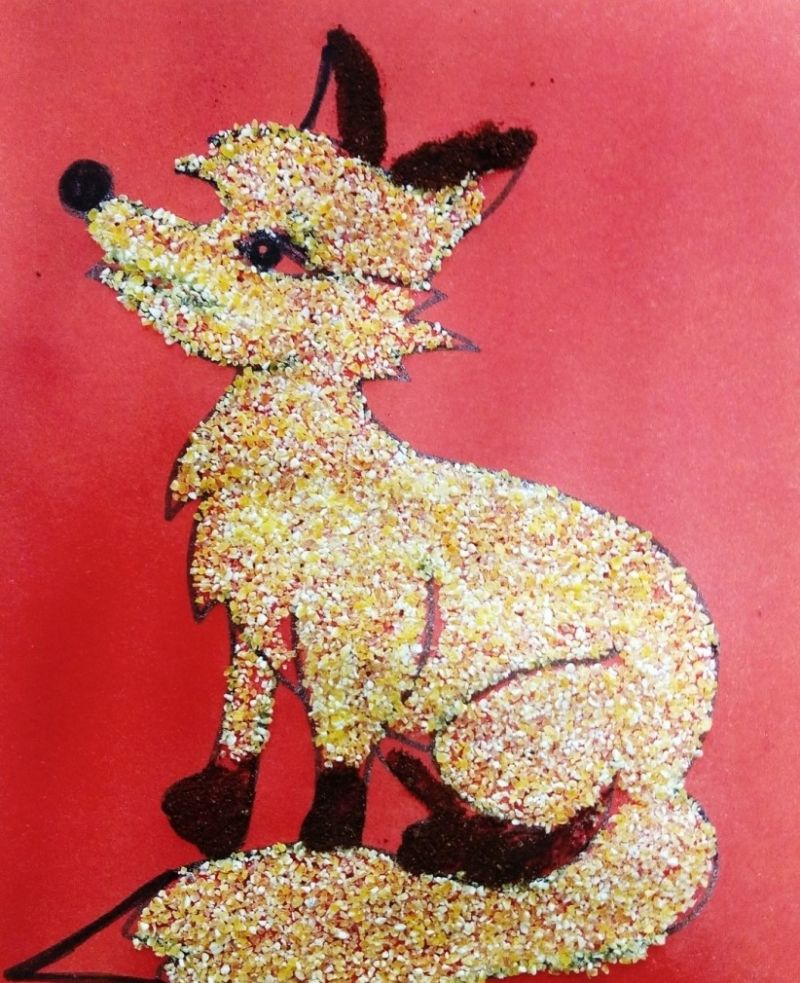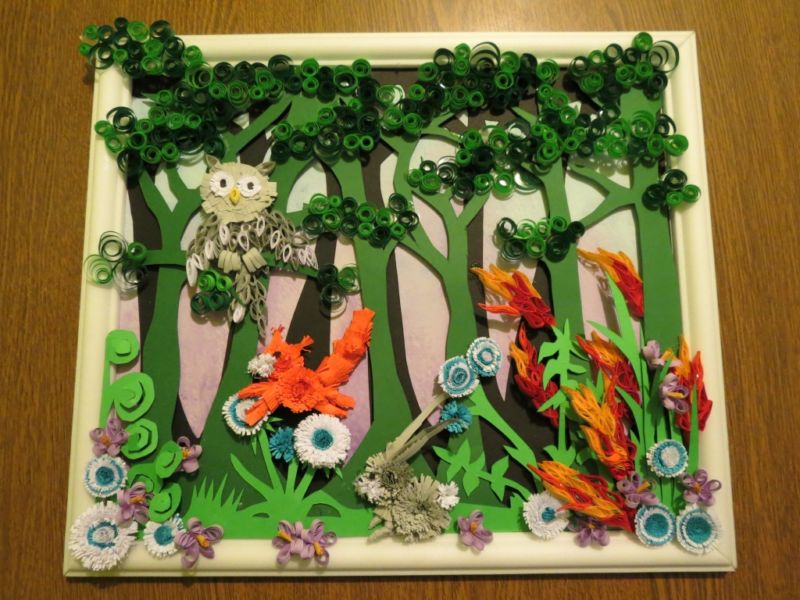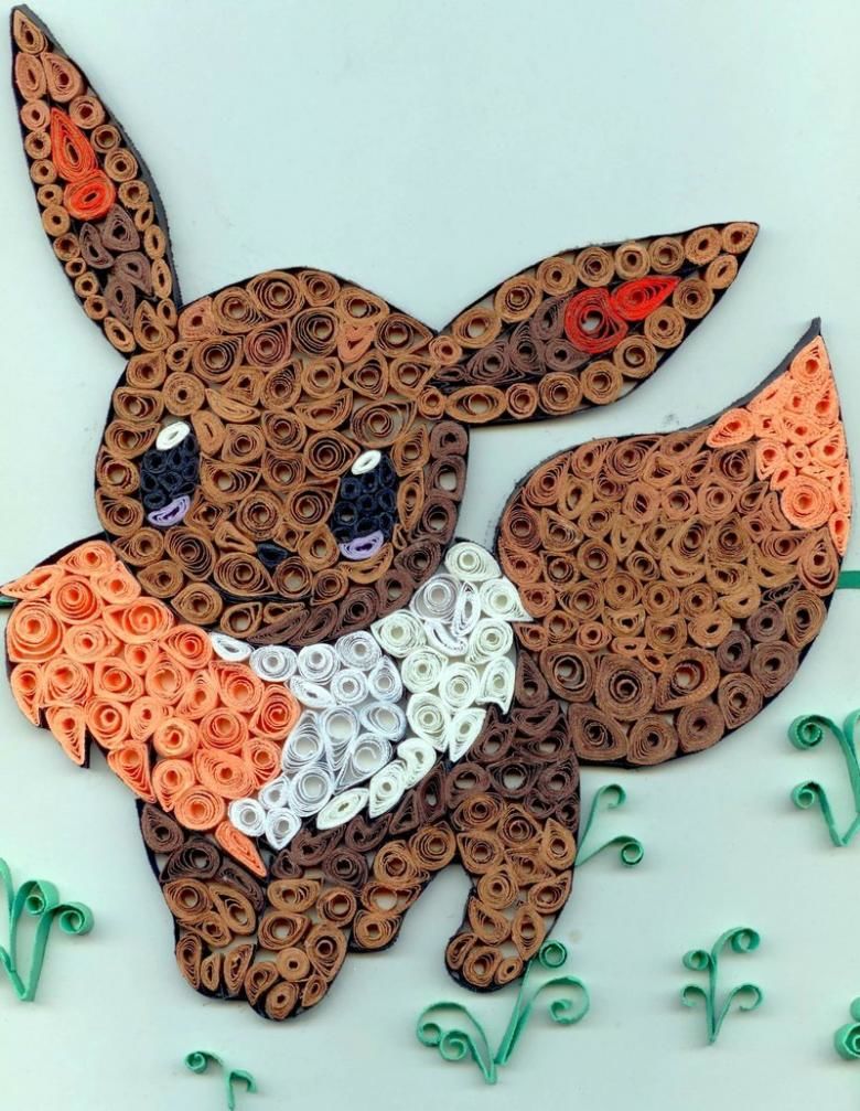 Квилингът за животни е много сложно приложение. Работата се състои в залепване на тесни ленти хартия, обикновено навити на спирали, върху картон.