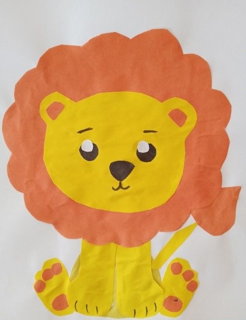За лъвчето използвайте жълта и оранжева хартия, пластмасови очи и шаблон. Необходимо е да проследите шаблона върху жълта хартия и да изрежете всички подразделения според шаблона. След това изрежете широка лента от оранжевата хартия и я нарежете напречно на тесни "юфка", като не режете лентата докрай.