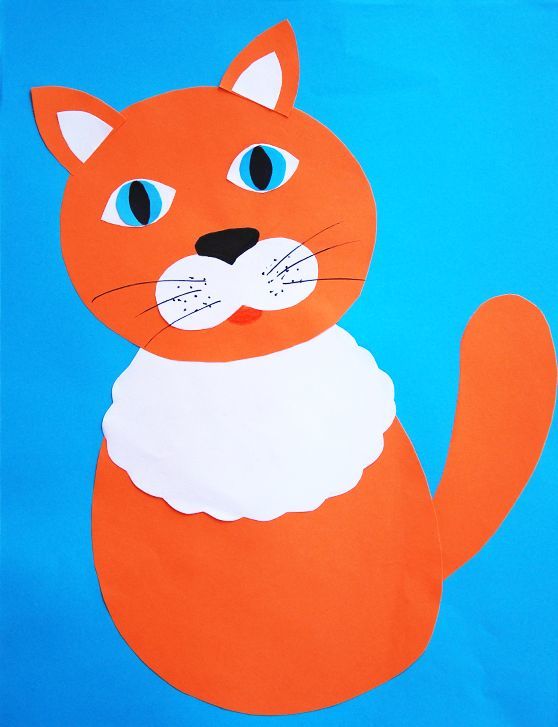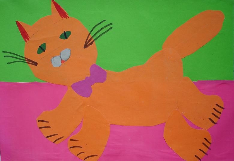 Като начало детето трябва да бъде помолено да избере цвета на бъдещата котка и да нарисува главата - кръг, тялото - овал, ушите - триъгълници, лапите - издължени правоъгълници и опашката - дъга на хартия в този цвят.
