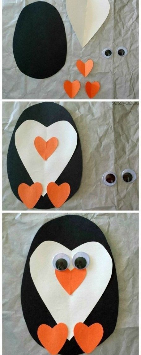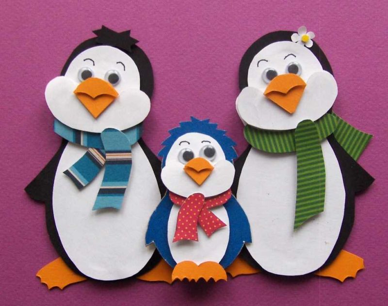 Бебето пингвин е подходящо за деца в средната група. Необходима ви е черна, бяла и оранжева хартия. Изрежете голям овал за тялото и продълговати триъгълници за крилата.