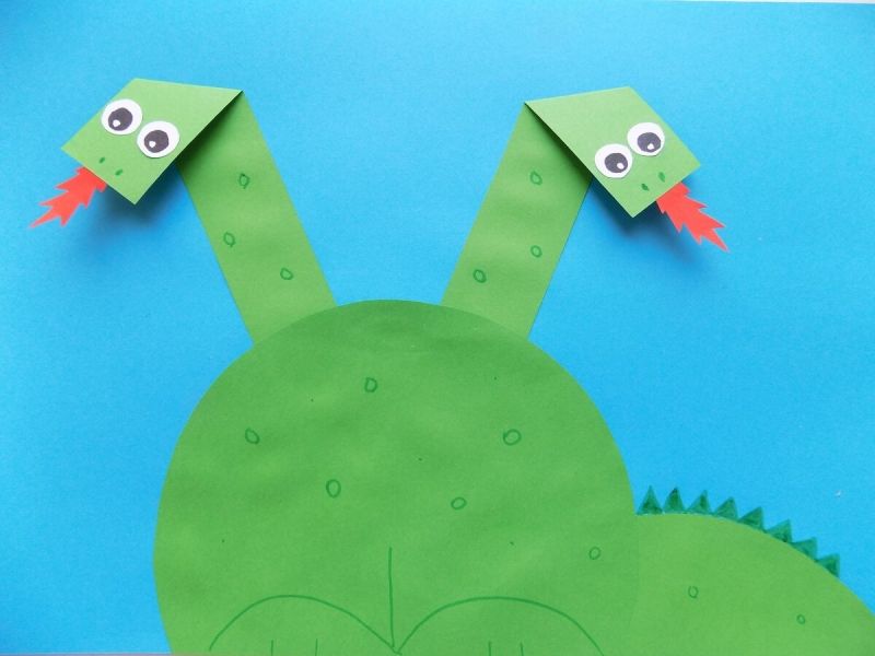 Свържете четвъртините на кръговете, за да образувате книга. Залепете я заедно със страниците "корица" към лист хартия. Тялото на дракона е оформено. Използвайте шаблона, за да нарисувате и изрежете главата, врата и опашката от червена хартия. Залепете ги от противоположните страни на тялото.