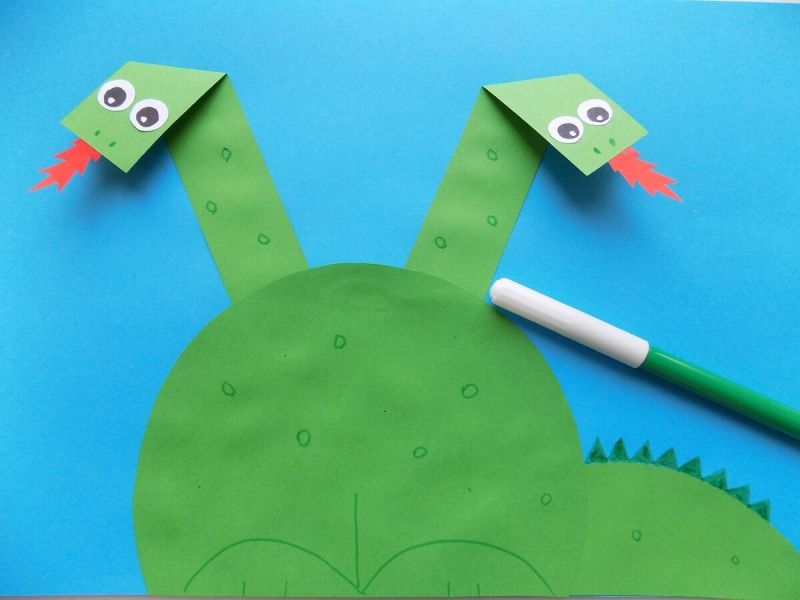 Залепете гребена на шията и кръговете по цялото тяло на дракона, включително шията и опашката. Нарисувайте око и зъби на дракона.
