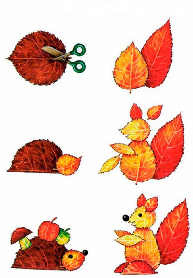 Работата с листа на практика не се различава от тази с хартия, с изключение на факта, че сухите листа са доста крехки и не се залепват толкова добре. Апликираните листа развиват детското въображение.