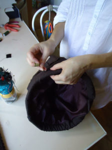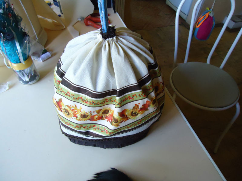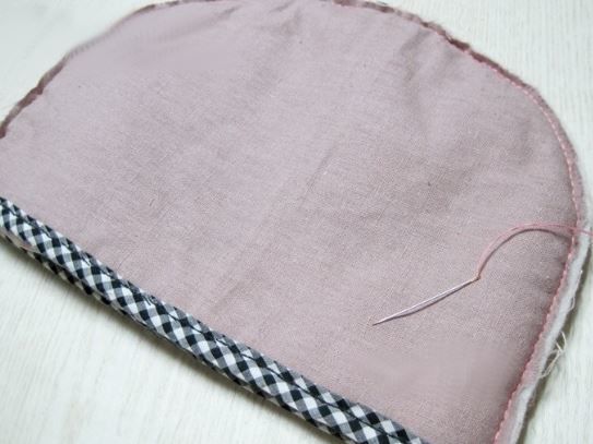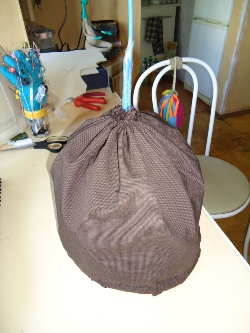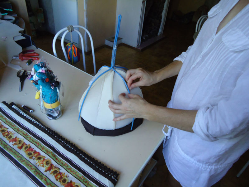 Поставете полата в капака и зашийте с дебел конец в горната част, за да образувате сноп. Ръчно зашийте обвивката, изолацията и подплатата. Покривът с изолация е готов. Сега можете да ушиете тялото на куклата и нейното облекло.