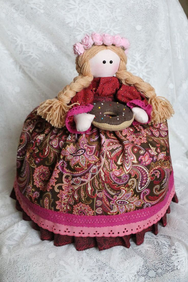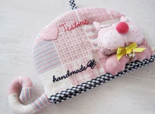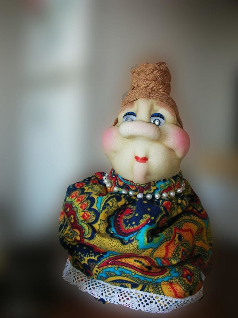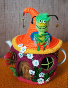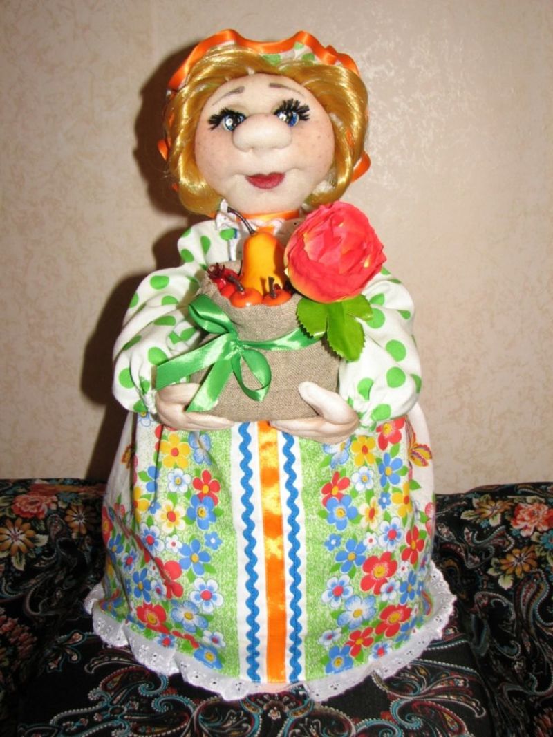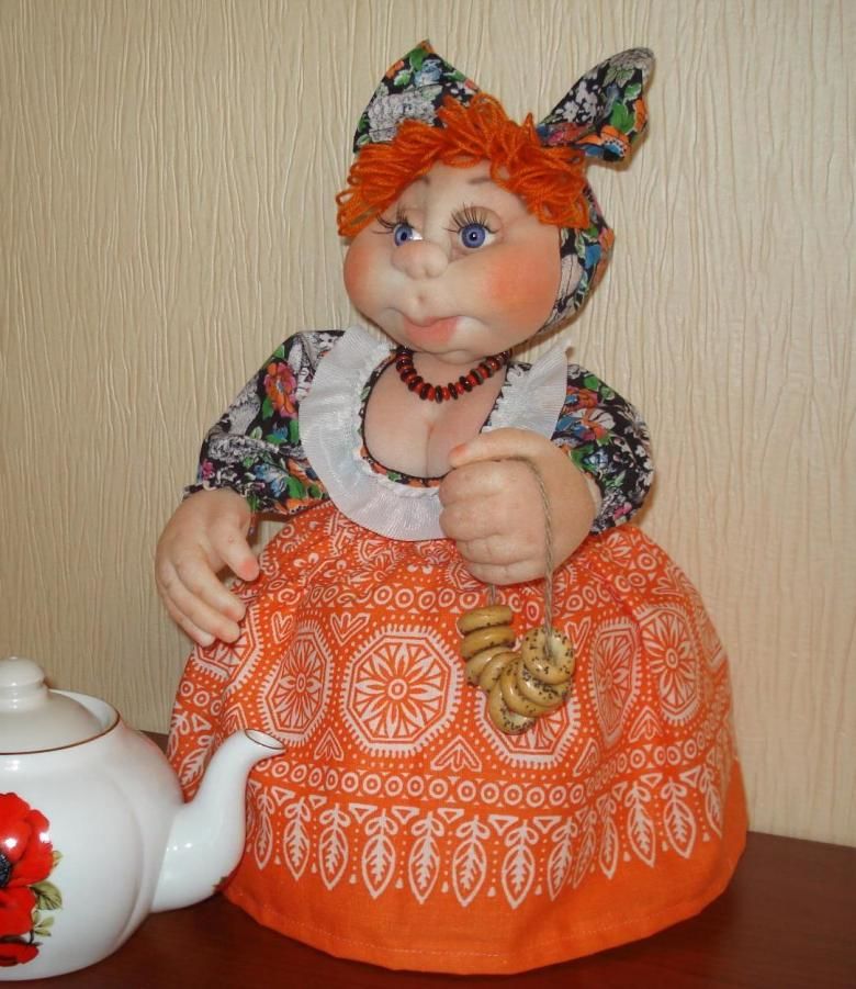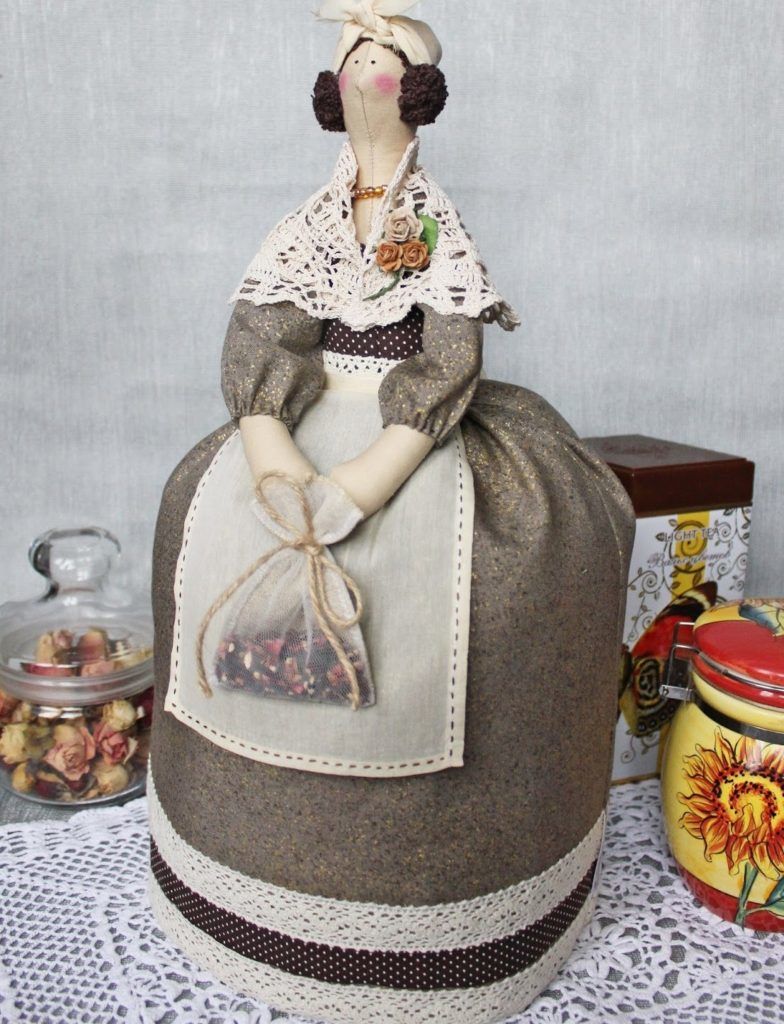 Атмосферна декорация на кухненския интериор - цветна баба върху чайника. Тя предава топлината на майсторката и създава комфорт. Съществуват безброй варианти на чаеното пакетче.
