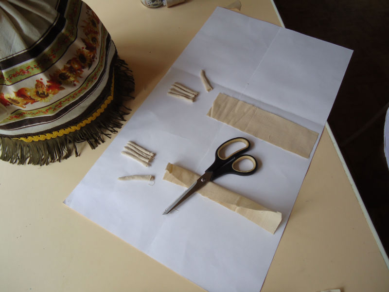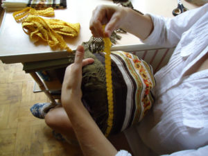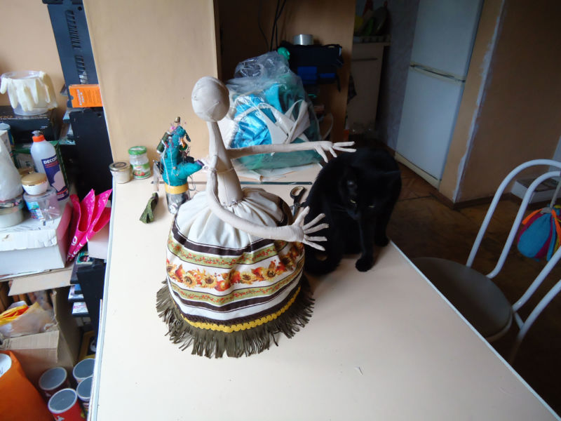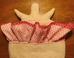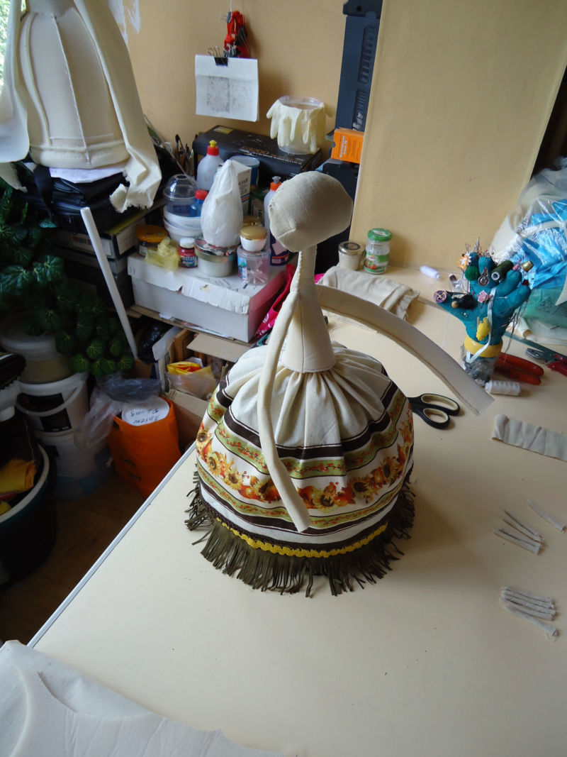 - Най-напред тялото се пришива към полата със сляп шев, като се поставя върху снопа в горната част на полата. Главата и ръцете се пришиват на последния етап от работата.