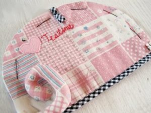 Шаблонът се пренася върху правоъгълно парче с изолация, очертава се с тебешир. Изрязване. Изрежете капачката от правоъгълно парче и я зашийте с машина или на ръка. Оставете отвор в горната част на капака, за да задържите капака на място. Получава се стабилна капачка.