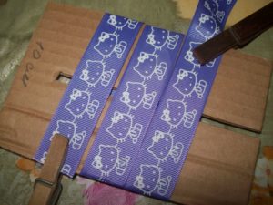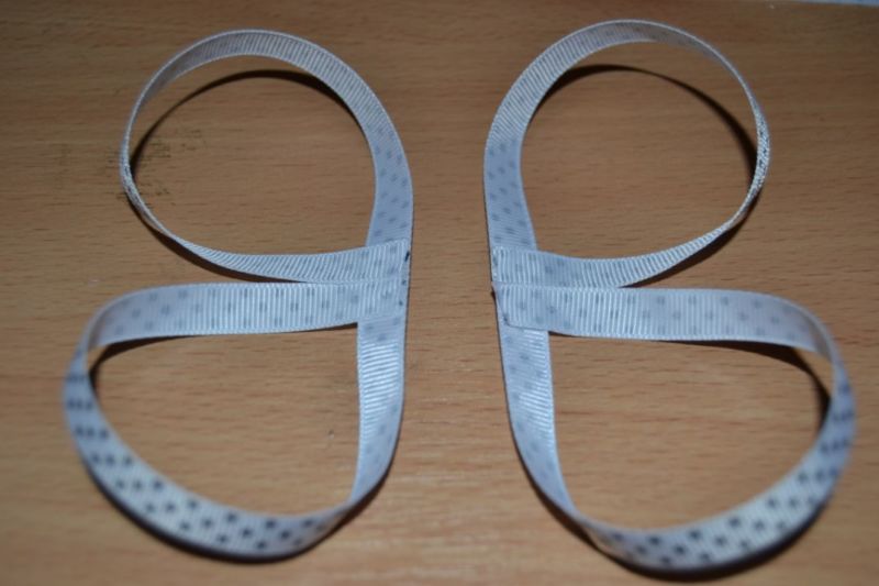 - За основата използваме репсова лента. Необходими са ви две парчета с дължина 8 см. Отрежете краищата косо и запечете, за да предотвратите разпадането на материала.