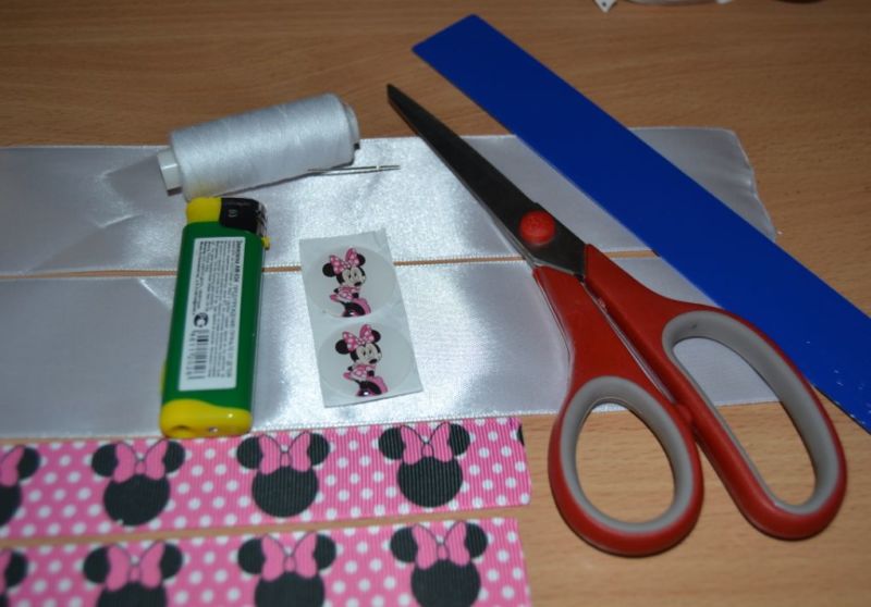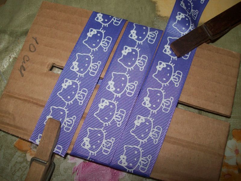 - Нарежете тясната сатенена панделка на парчета с дължина 8 см (едно парче в един цвят и две парчета в друг цвят).