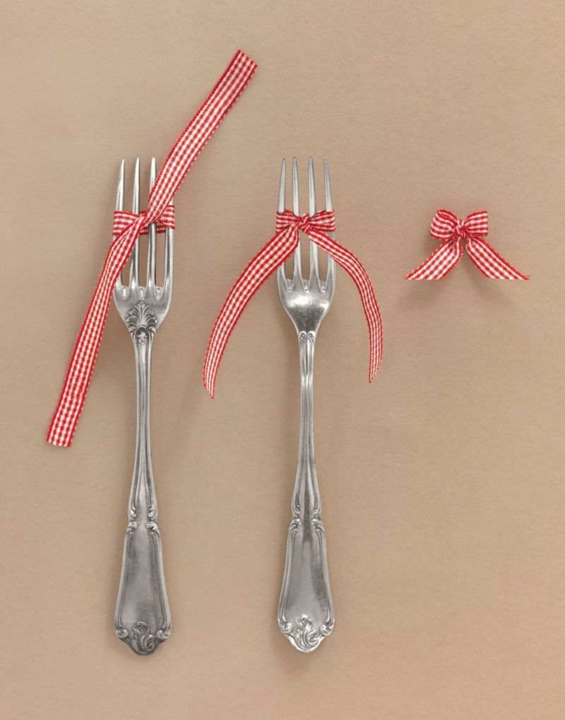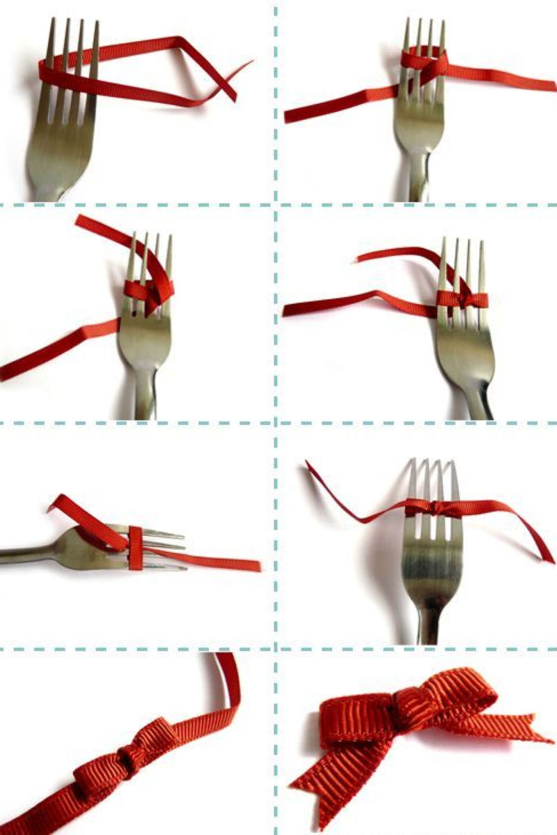 Обикновените елегантни панделки се оформят с помощта на обикновен прибор за хранене - вилица. С помощта на този прост инструмент могат да се изработят дори най-малките версии (под един сантиметър). Те се използват за украса на играчки, картички, чанти и детски дрехи.