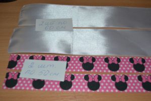 - Нарежете сатенената панделка на дължини 20 см, 18 см и 7 см за дългата панделка и 55 см за тясната панделка.
