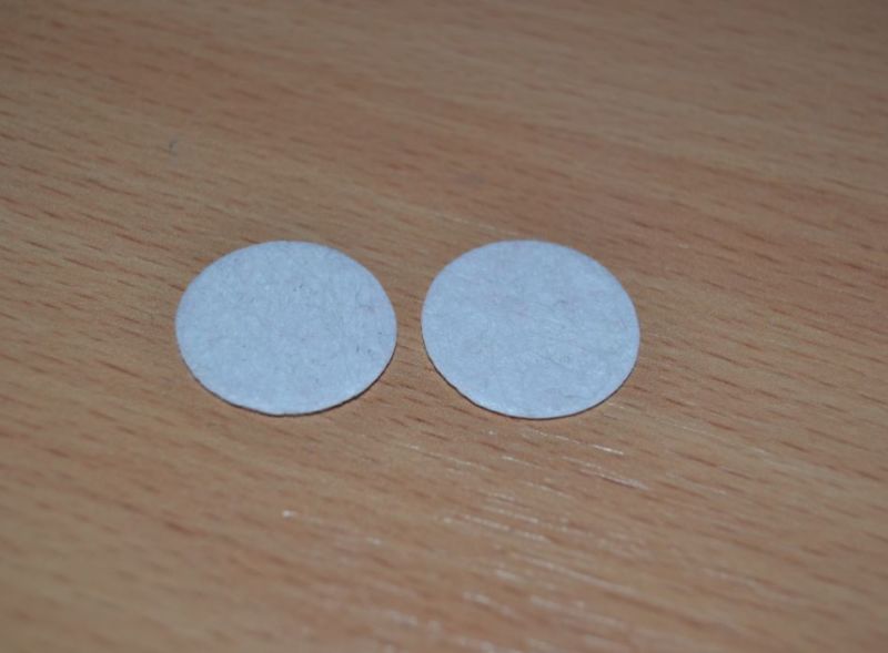 - Изрежете кръг с диаметър 8 см от твърдия филц. Направете дупки в кръга и промушете свободния край на панделката през дупките.