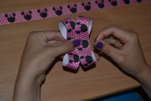 - Залепете сатенените парчета към централното парче лента, като ги поставите по диагонал.