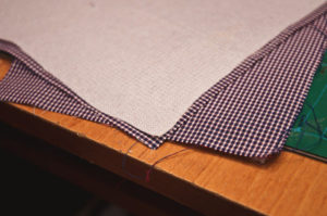 - Сгънете сатенените парчета едно върху друго (по-малкото парче отгоре) и ги зашийте в средата.